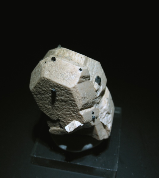 A plagioclase crystal showing a nice albite twin. Small sprinkles of tourmaline crystals also cover the sample. Approximately 1 and 1/4ths of an inch high. Crystal locality: Erongo Complex, Namibia.