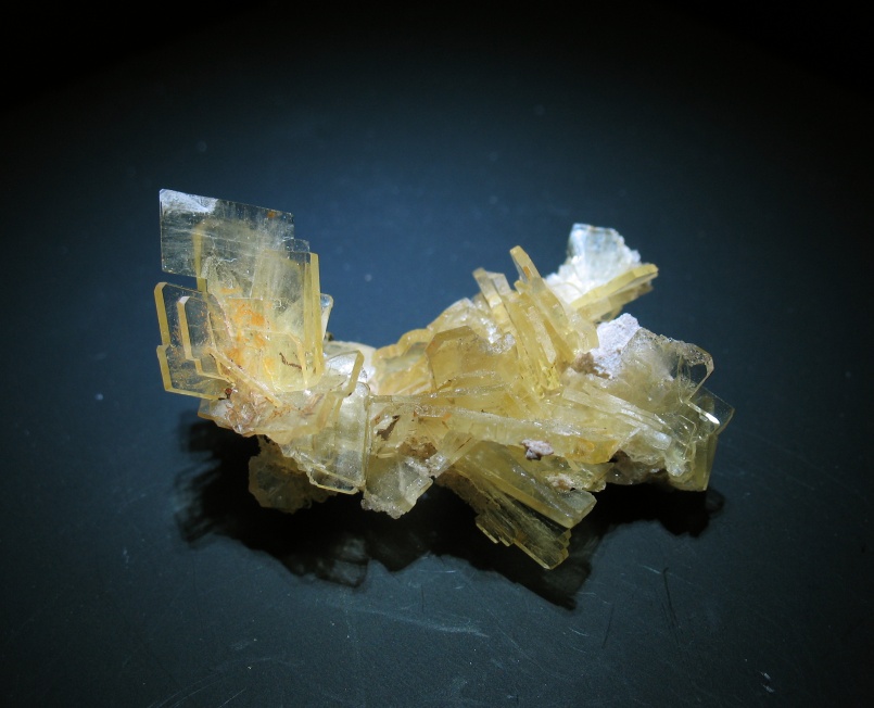 Clear yellow tabular crystals of barite arranged in a nice cluster. The element barium (which barite gets its name from) is quite heavy, making this specimen feel heavier than expected. Specimen is about 2 inches long.