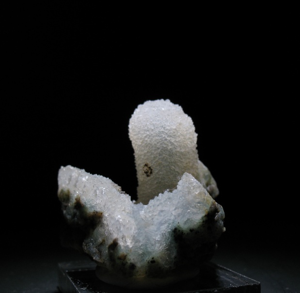 A small chalcedony sample. Chalcedony is a microcrystaline variety of quartz. If you look closely you can see the green center where the chalcedony grew on. Crystal measures approximately 1 inch.