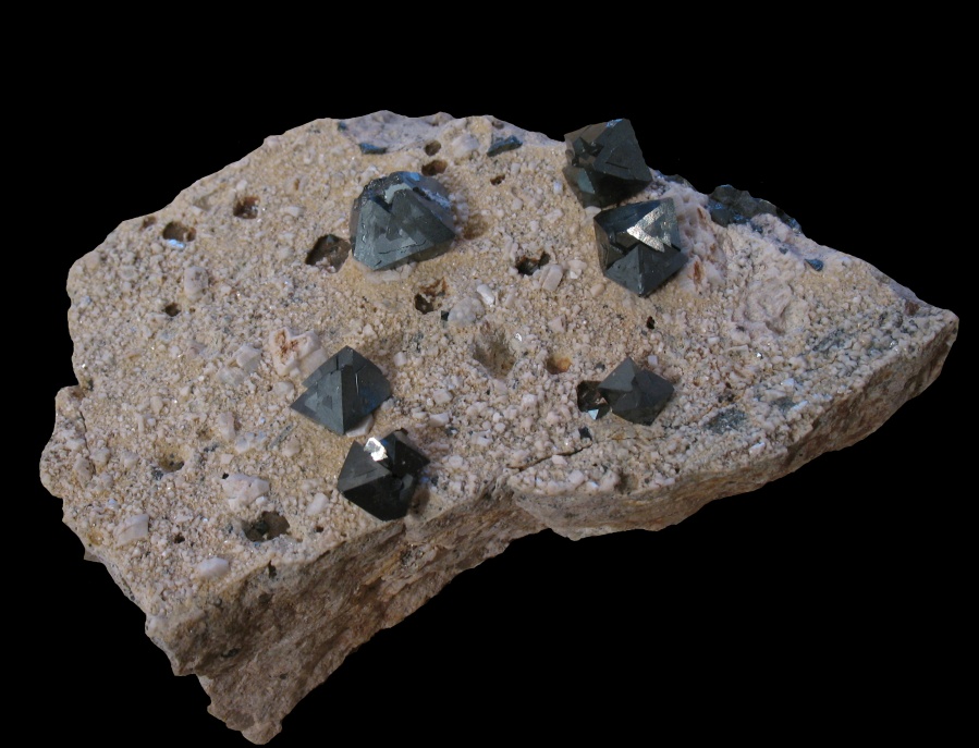 Nice octohedrons of magnetite within a feldspar matrix. The octohedrons of magnetite are (surprise) magenetic, so small metal objects will stick to them. The whole sample is about 3 inches long.