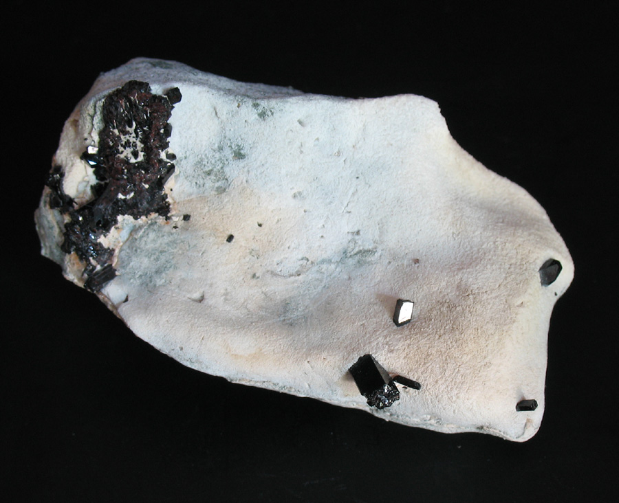A very interesting peice featuring various crystals of dark neptunite. While not a mineral originally in the classroom collection, the name in addition to the errie matrix the crystals rest in was too much for me to resist. Specimen is about 3 and a half inches long, and comes from San Benito County, California.