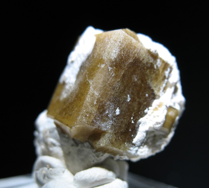 A decent crystal of vesuvianite with some host matrix. Vesuvianite is named for its original founding locality, the Mt. Vesuvius area. Crystal measures about half an inch high.