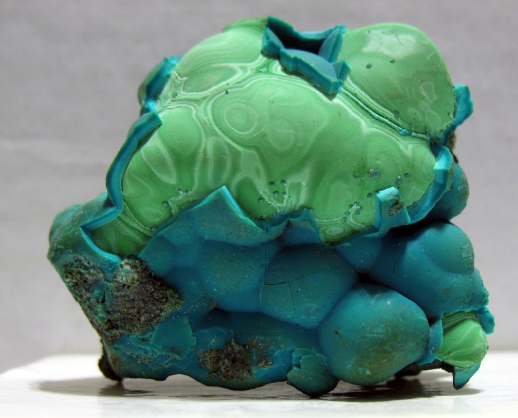 Bubbly blue chrysocolla and malachite can be seen in this sample. The chrysocolla almost looks like some kind of candy shell that covers the malachite. This specimen measures approximately an inch and a half long.
