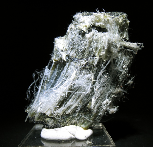 Chrysotile is definately one of the weirder minerals. Its crystal structure is spirical, the crystals form in spirals and therefore are not able to produce any definate crystals like those commonly seen in other minerals. In addition to this, the peculiar habit leads the mineral to have a soft, wool like feeling. Chrysotile is a so called 'safe' asbestos and is still used in some applications today. Most asbestos are composed of small, needle like minerals, but because of chrysotile's soft, spirical habit, the inhiliation of chrysotile is by far less harmful than its 'bad asbestos' counterparts. Nevertheless, it is still seen as a cause for concern and shows limited use in industry as of late. Specimen measures nearly 2 inches tall and comes from Coleraine, Quebec, Canada.
