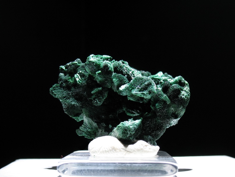 A nice, fiberous cluster of green malachite crystals. malachite often does not form crystals, but these smaller crystal clusters are often what it forms when found crystaline. Crystal is about an inch long and comes from Shaba Province, Zaire, Africa