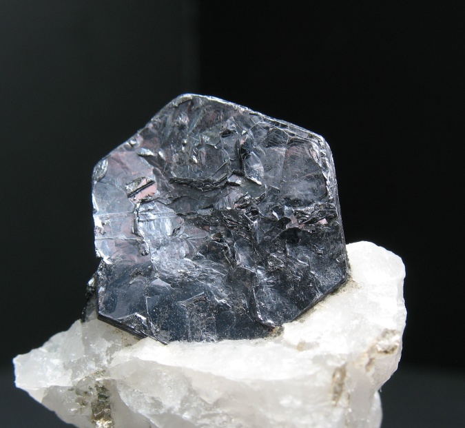 A metallic pale blue platy crystal of molybdenite. Molybdenite is extremely fragile, with a hardness close to 2, and is often not found in well formed crystals. This crystal preserves the hexagonal crystal structure of molybdenite very well. The crystal measures about half an inch tall.