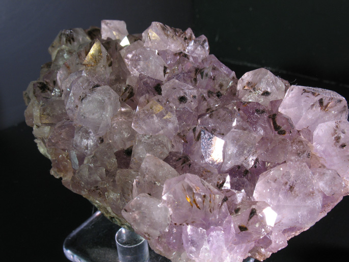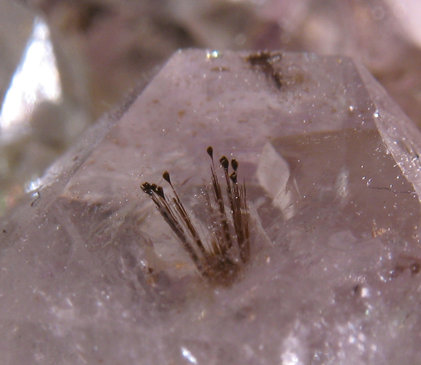 A nice, lightly purple cluster of amethyst crystals with lots of radiating, bronzy cacoxenite crystals branching from within. The close up image shows much nicer details in the cacoxenite. Oftentimes, when found, this inclusion is undesirable as it 'muddies up' the otherwise well defined purple appearance of the amethyst. As an inclusion collector, I enjoy them, however. The whole cluster is about 3 1/2 inches long.