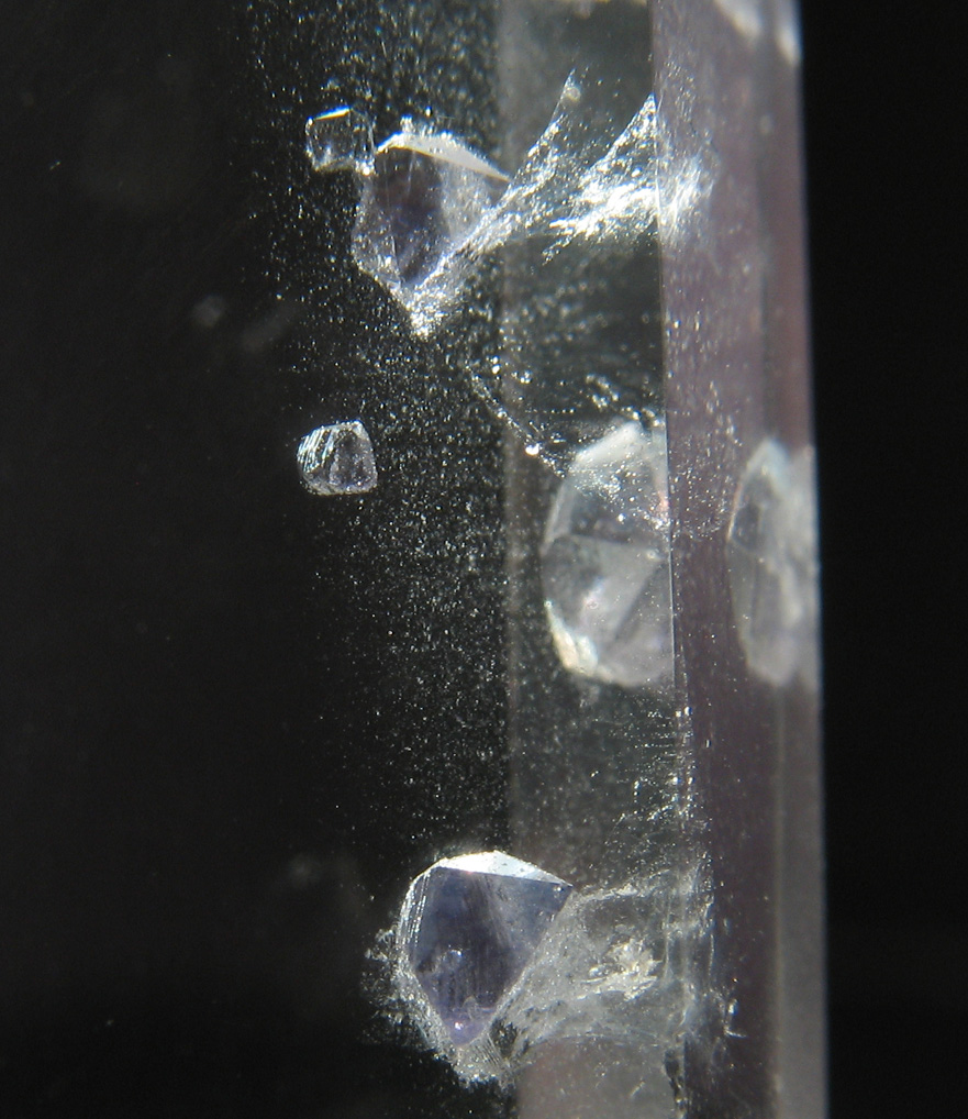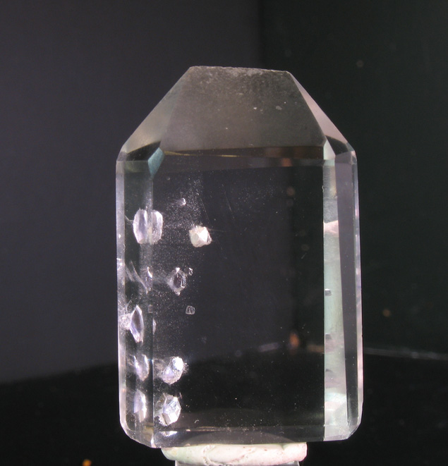 Here is another crystal of quartz with fluorite inclusions, from the same locality as the other crystal. This crystal, however, has had the natural faces polished to ease the viewing of the fluorite inclusions within. These fluorites are clearly octohedral when viewed under slight magification. The quartz crystal is approximately an inch tall.