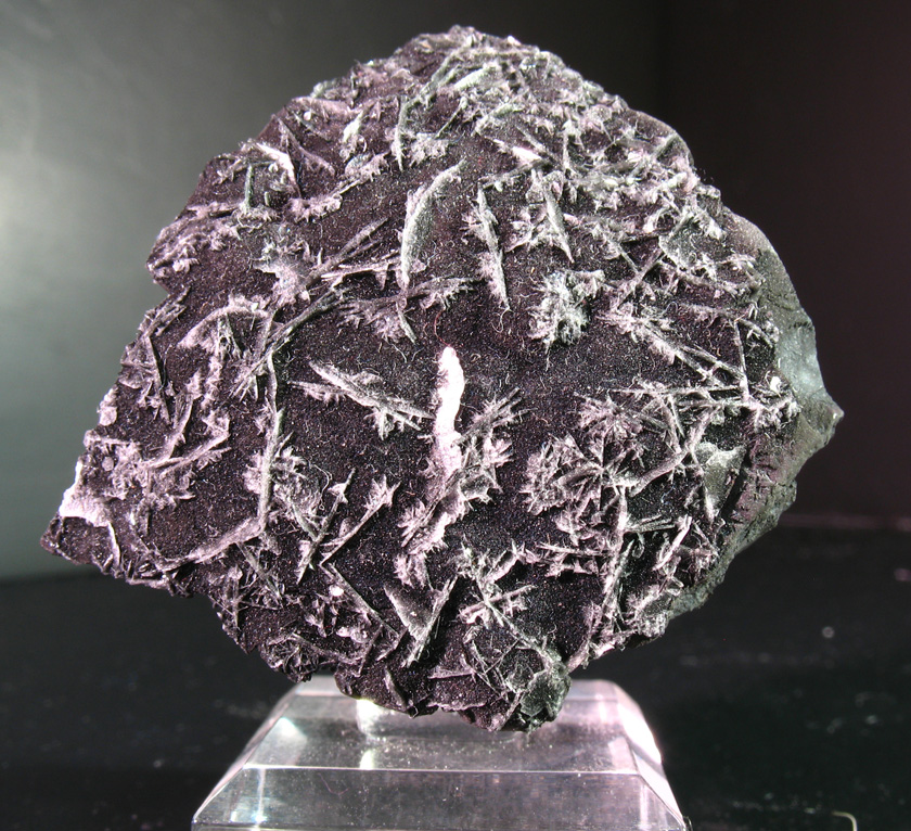 Romanechite is another 'crypto' crystaline mineral that typically does not form crystals, but instead forms in botriodial, grape like masses. This particular romanechite sample has lots of small blades of white barite growing all about, giving it an unusual appearance. This sample measures about an inch and a half wide.