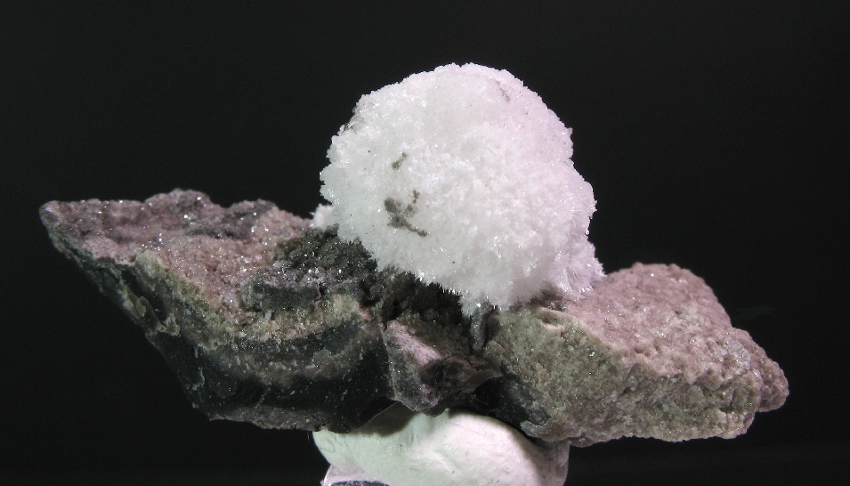 A large cluster of very tiny white strontianite crystals tops this sample. Looks like a small snowball! The crystal cluster is about 1/4th of an inch in length.